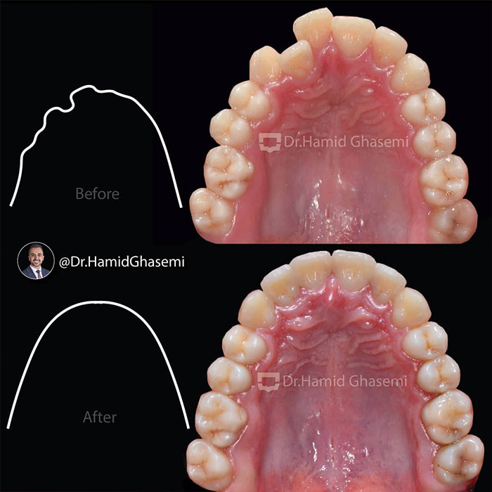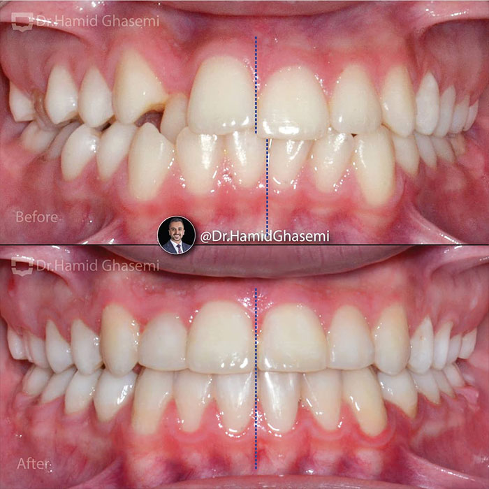 درمان ارتودنسی بدون جراحی و بدون کشیدن دندان در کیس همراه با کراودینگ شدید به علت تنگی قوس فک بالا در مدت ۱۸ ماه انجام شد.