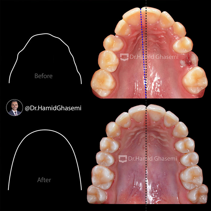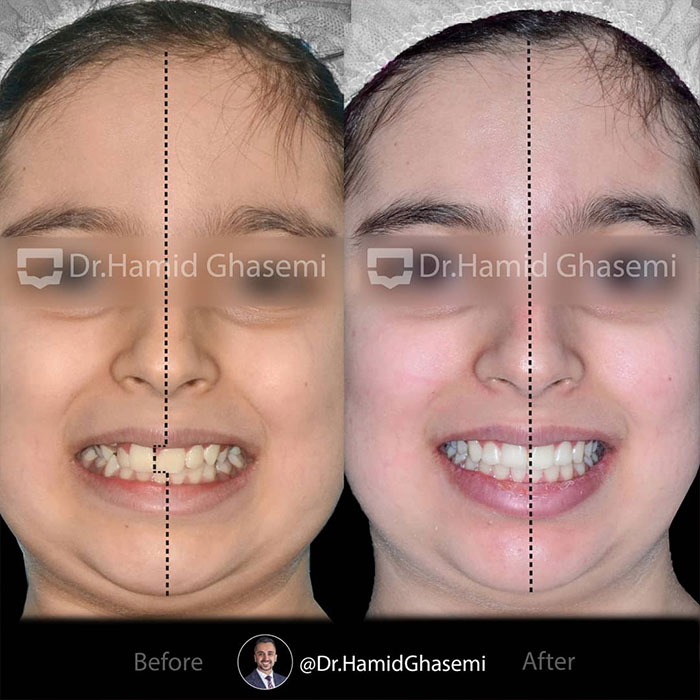 درمان ارتودنسی بدون کشیدن دندان در کیس همراه با دندان نیش نیمه نهفته و شیفت میدلاین دندانی.