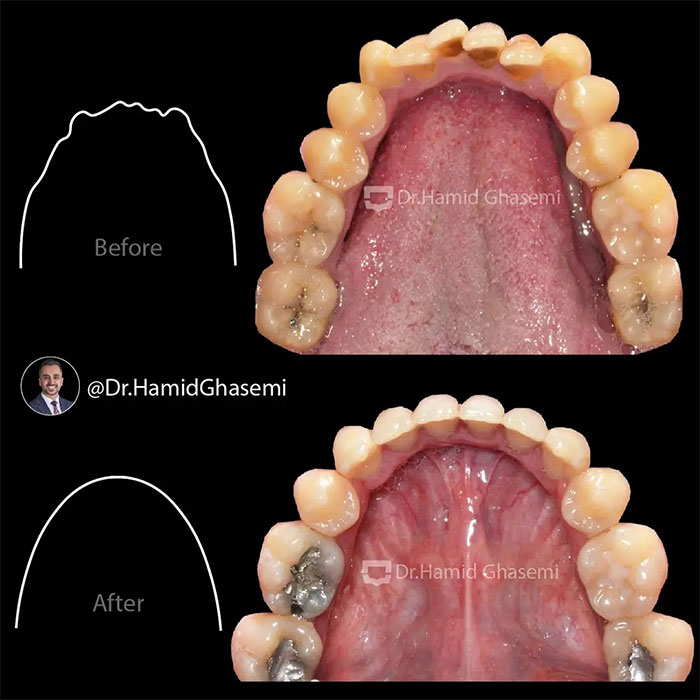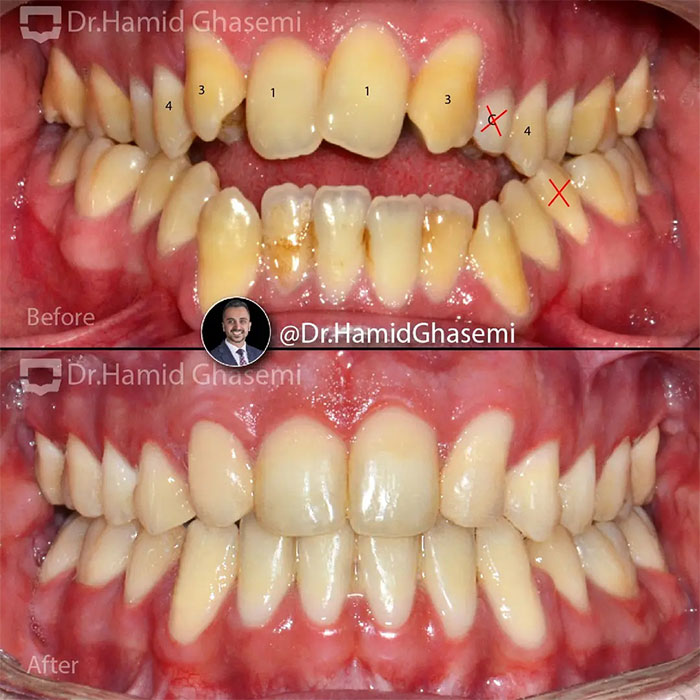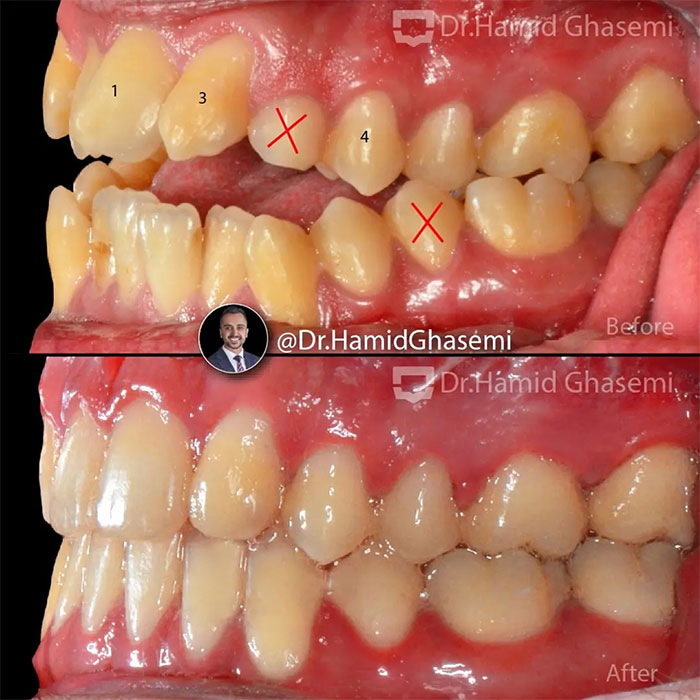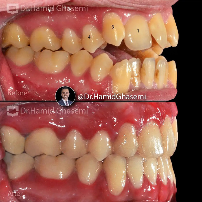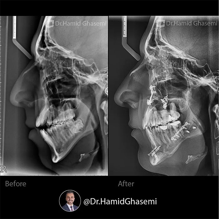 درمان ارتودنسی همراه با جراحی هر دو فک در کیس open bite + long face در مدت ۲۴ ماه انجام شد. دندانهای نیش فک بالا جایگزین دندانهای غایب لترال شدند.