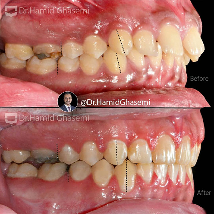 درمان ارتودنسی کیس کلاس ۲ با مشکل عقب زدگی فک پایین و جلوزدگی دندانی در فک بالا با کشیدن دندانهای عقل بالا و توتال آرچ دیستالیزیشن در فک بالا و همچنین استفاده از دستگاه فرسوس جهت ادونسمنت دنتیشن فک پایین در مدت ۲۰ ماه انجام شد.