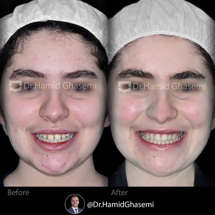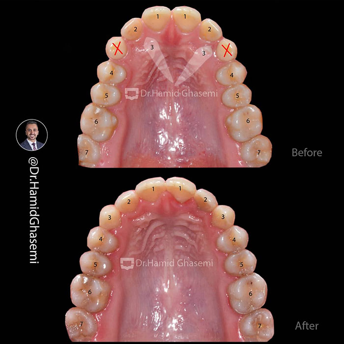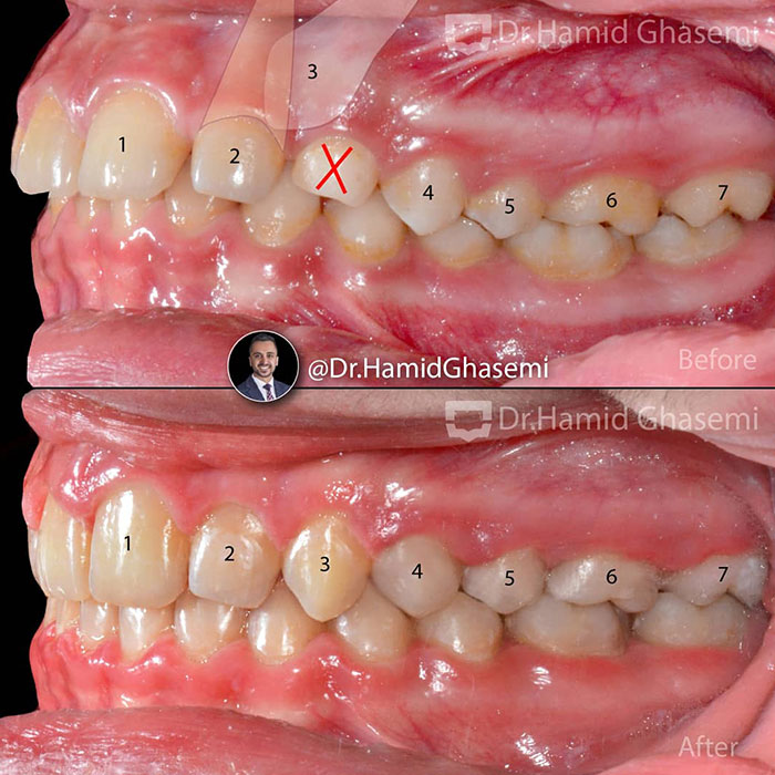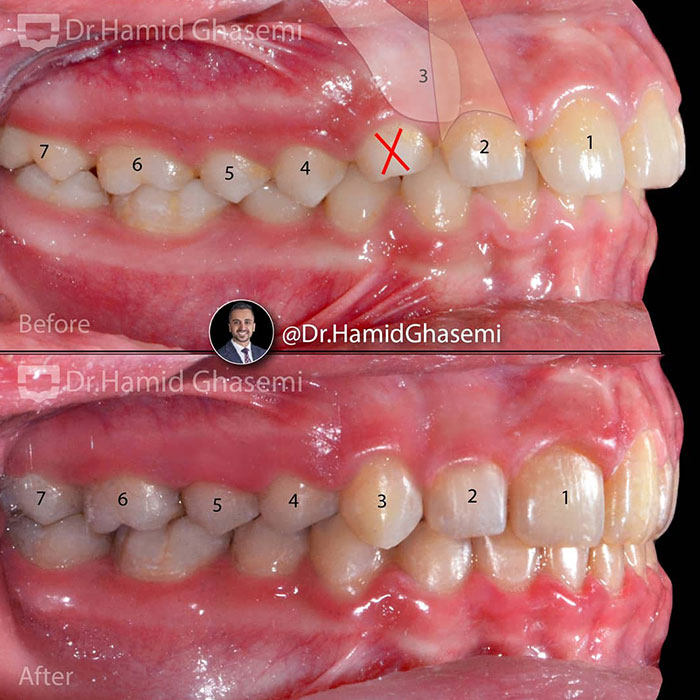 دندانهای نیش نهفته فک بالا با استفاده از تکنیک force eruption به قوس دندانی هدایت شدند و به طور همزمان فواصل بین دندانی و جلوزدگی دندانهای قدامی در مدت ۱۸ ماه اصلاح شدند.