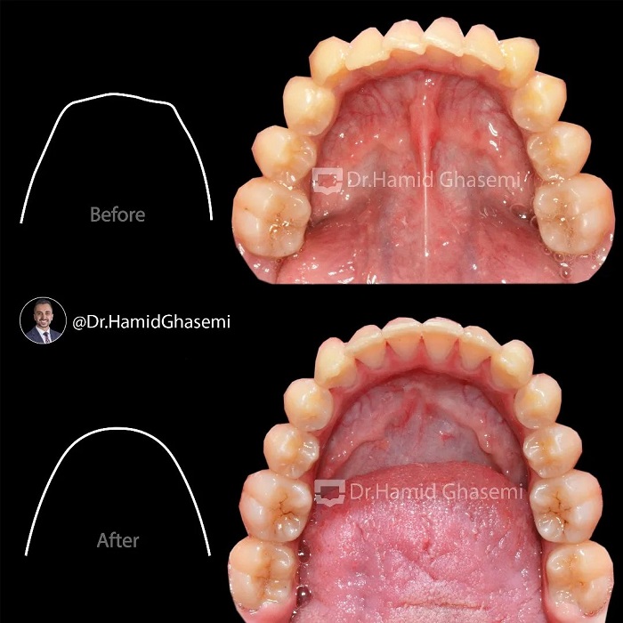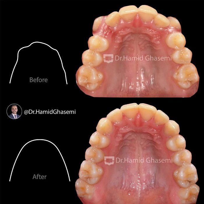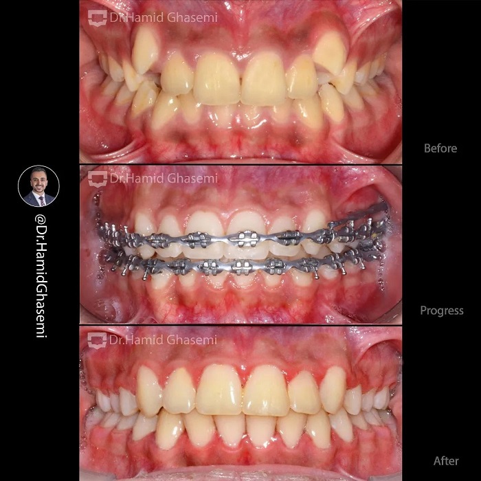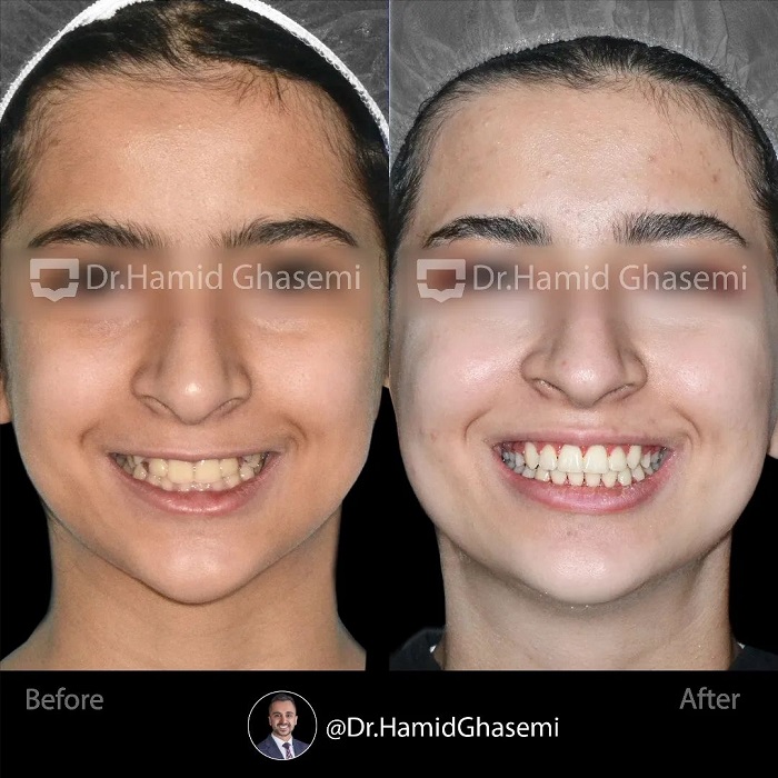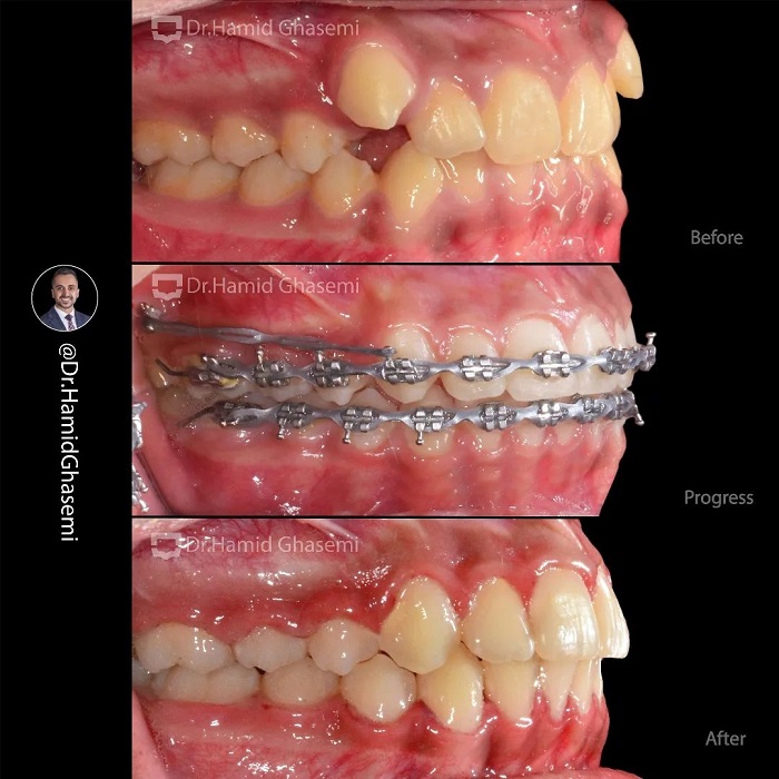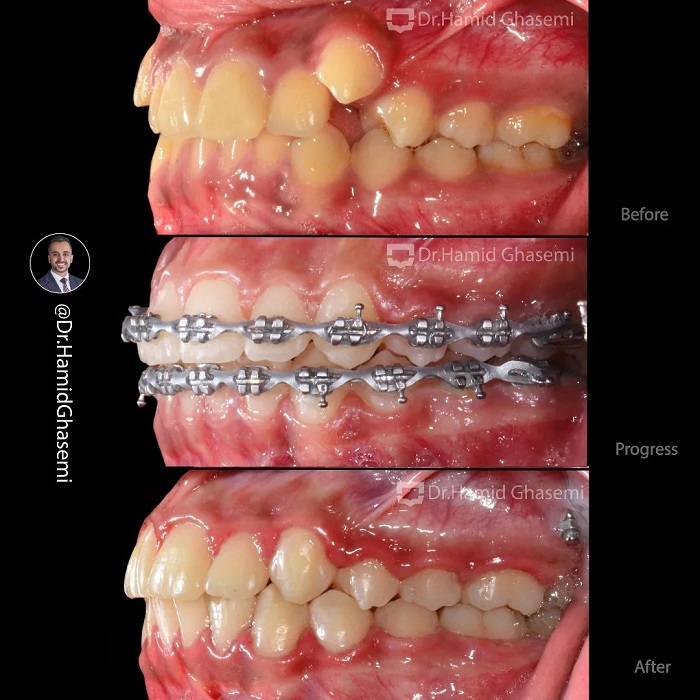درمان ارتودنسی بدون کشیدن دندان در کیس با مشکل بیرون زدگی دوطرفه دندانهای نیش بالا در مدت ۱۸ ماه انجام شد.