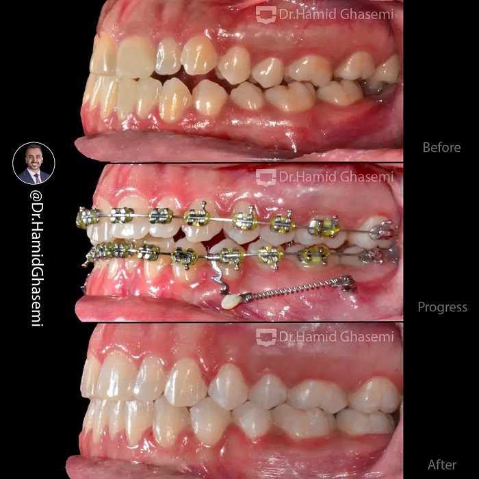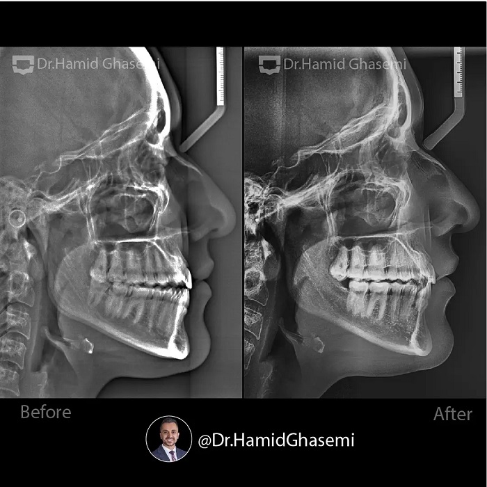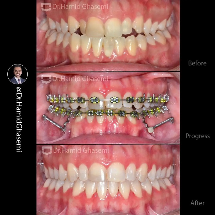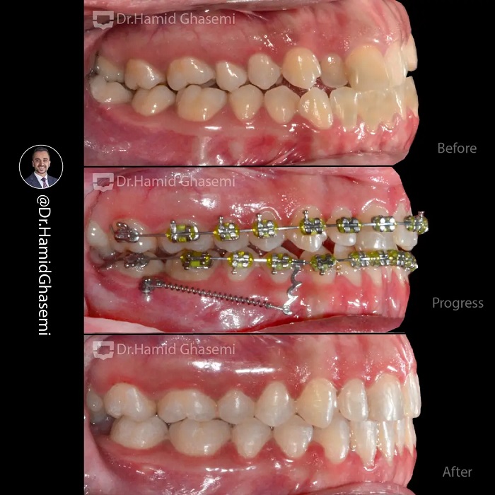 درمان ارتودنسی بدون جراحی فک در کیس کلاس ۳ با بیرون زدگی فک پایین با استفاده از دیستالیزیشن فک پایین بعد از کشیدن دندانهای عقل فک پایین به کمک تکنیک Tads system ( اسکرو در باکال شلف فک پایین + فنرهای fatigue resistante ) در مدت ۲۰ ماه انجام شد. این کیس بوردر لاین نمونهای بارز از اهمیت انتخاب روش درمان ارتودنسی با و یا بدون جراحی فک را نشان میدهد که تا چه میزان امکان درمان ارتودنسی بدون جراحی فک با استفاده از تکنیک Tads system وجود دارد.