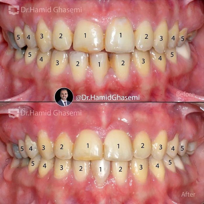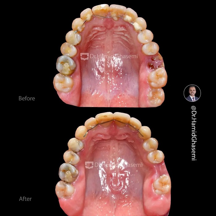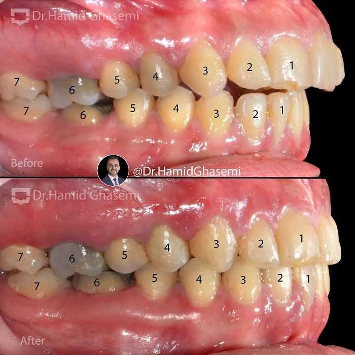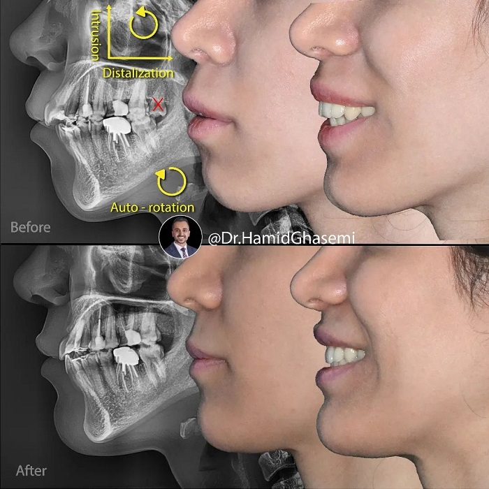 توتال ایمپکشن و توتال دیستالیزیشن بدون جراحی فک در فک بالا و به دنبال آن auto rotation(چرخش فک پایین به دنبال جابجایی فک بالا) مندیبل با استفاده از Tad system (ساخته شده از Double TPA اختصاصی متصل و مينی اسکرو). بیمار با سابقه انجام ارتودنسی ناموفق همراه با کشیدن دندان قدامی در فک پایین و ارجاع بیمار به جراح جهت انجام جراحی ۲ فک بعد از ۲ سال درمان ارتودنسی به امید انجام درمان مجدد بدون جراحی فک به کلینیک بنده مراجعه کردند و خیلی خوشحالم که در انتها به نتیجه دلخواه رسیدند. به تغییرات ایجاد شده در صورت (۱/۳ تحتانی ) و فکین بعد از درمان توجه کنید. ورق بزنید و نظر خودتون رو برامون کامنت کنید. 💪💪💪