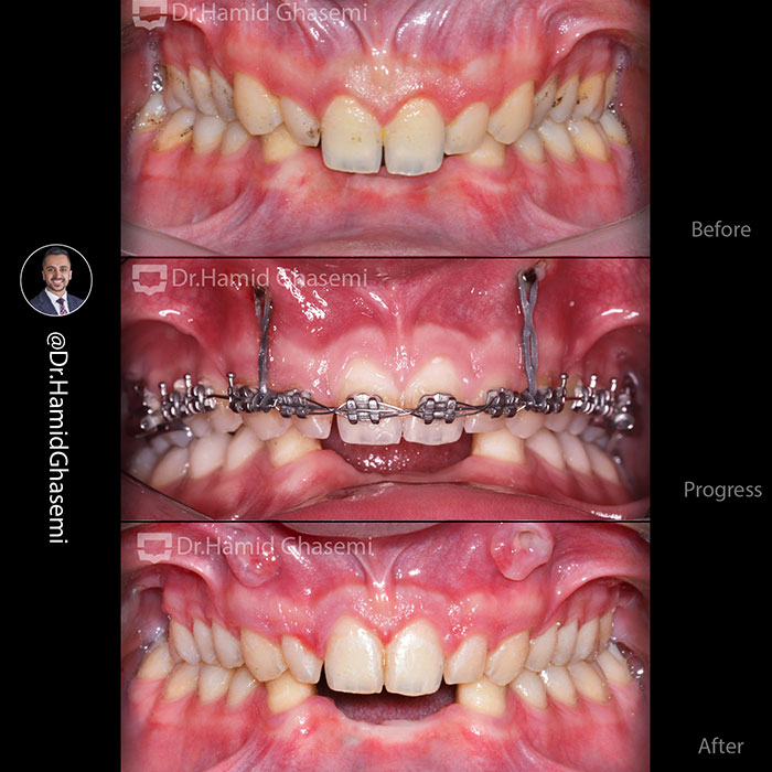 درمان ارتودنسی adjunctive (کمکی ) قبل از درمان ایمپلنت دندانهای قدامی فک پایین. اینتروژن دندانهای قدامی فک بالا با استفاده از اسکرو های بین ریشه ای جهت اصلاح دیپ بایت و ایجاد فضای مناسب برای قرارگیری تاج ایمپلنت های دندان های قدامی فک پایین انجام شد.