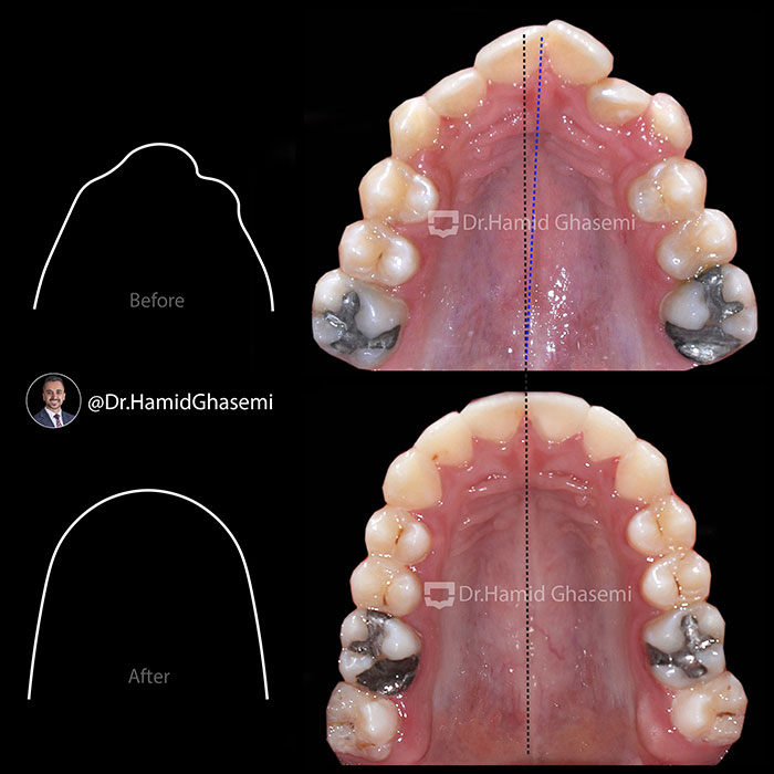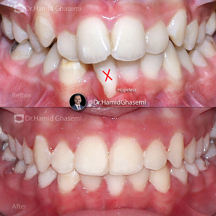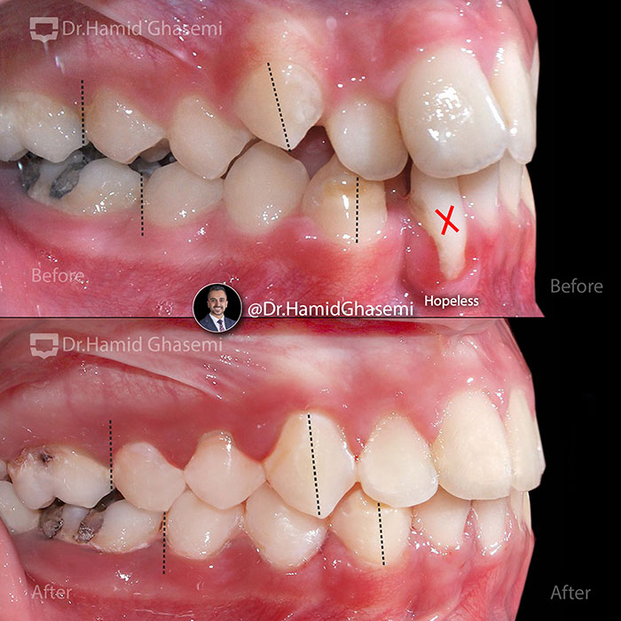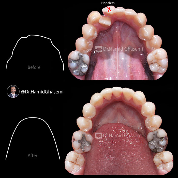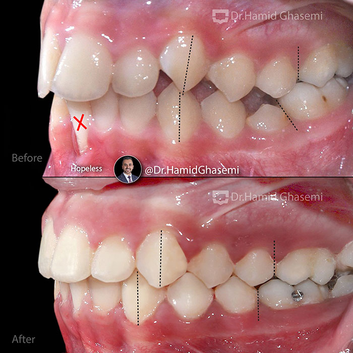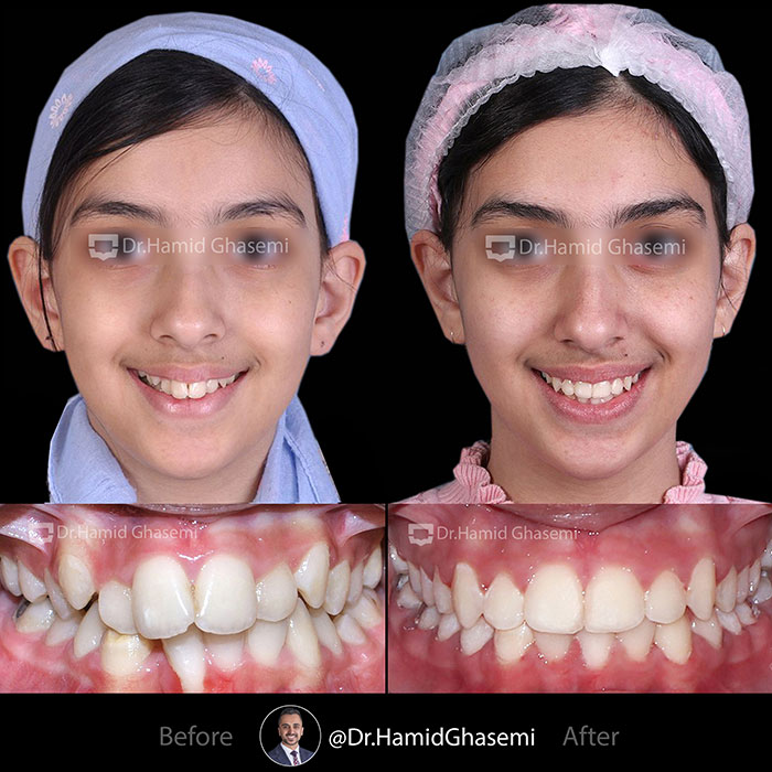 در فک پایین به علت وضعیت و پروگنوز بسیار ضعیف، دندان لترال کشیده شد. لازم به ذکر است درمان ارتودنسی در کیسهایی که طرح درمان با کشیدن دندان قدامی فک پایین همراه باشد ایجاد ایدهآلها از قبیل رابطه کانینی کلاس ۱، اوربایت، اورجت و شیب دندانهای قدامی یکی از چالشها در میان متخصصین ارتودنسی میباشد. در این کیس تمامی ایده آل ها همراه با خلق بهترین طرح لبخند میسر شد.
