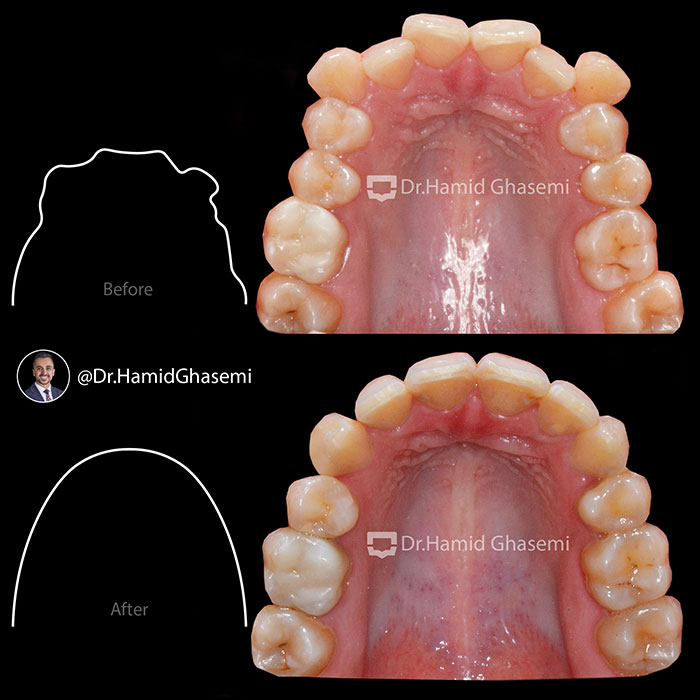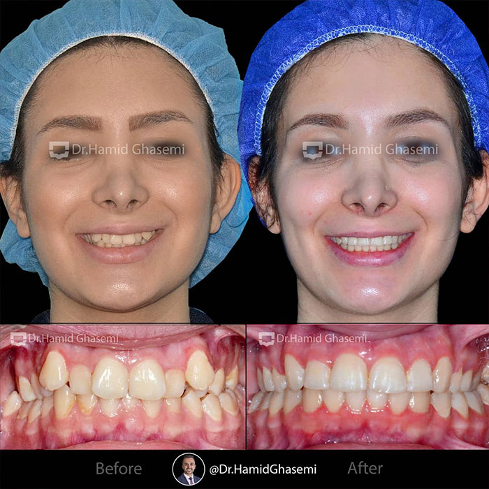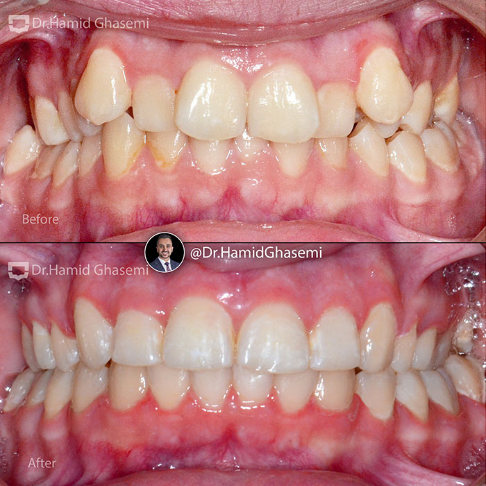 درمان ارتودنسی بدون جراحی فک در کیس کلاس ۲ همراه با کراودینگ شدید.