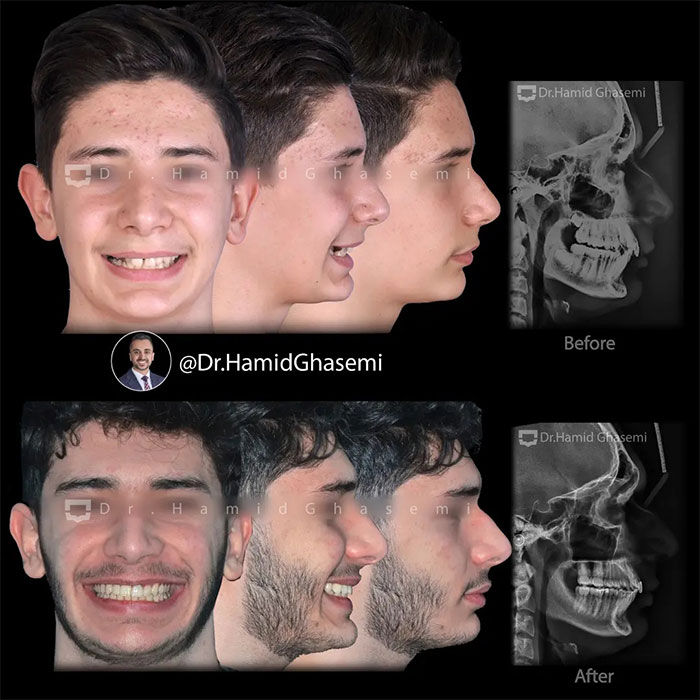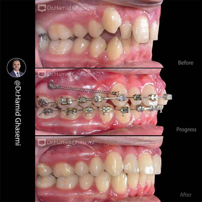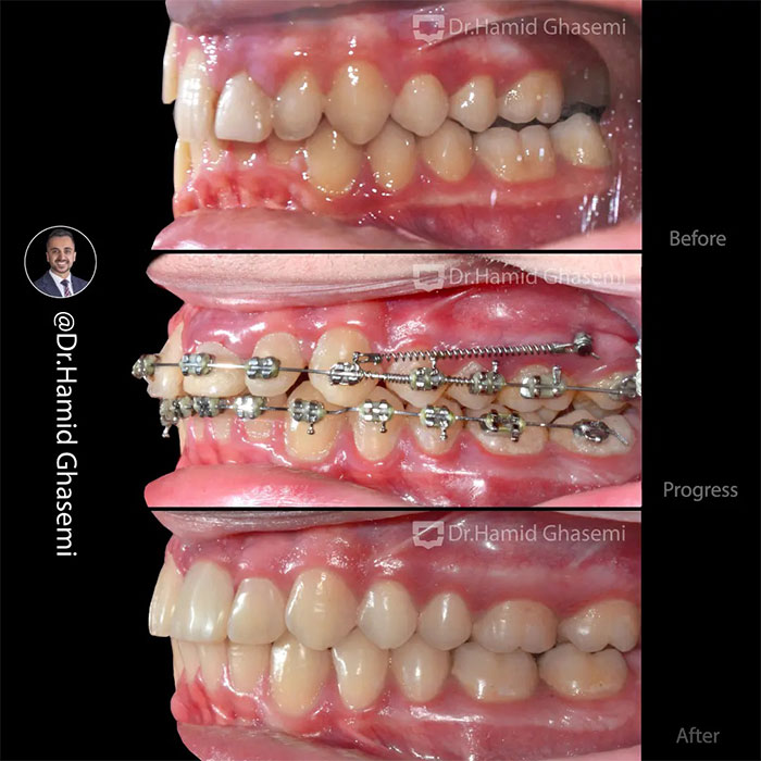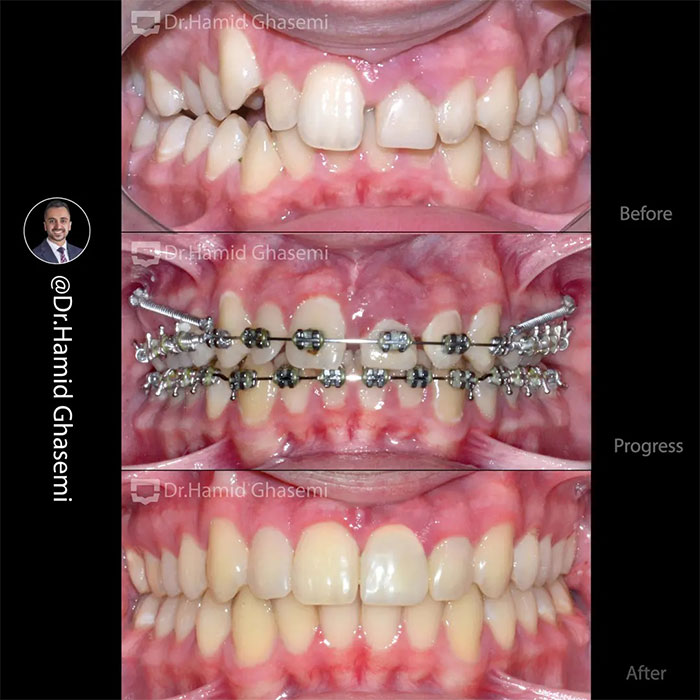 درمان ارتودنسی در کیس کلاس ۲ با سابقه تروما بر روی دندان سانترال بالا در سمت چپ که باعث شکستگی تاج دندان و اینتروژن دندان شده بود بدون کشیدن دندان در مدت ۲۲ ماه انجام شد. در فک بالا دیستالیزیشن با استفاده از اسکرو های زایگوماتیک جهت اصلاح رابطه کلاس ۲ انجام شد و دندان سانترال با سابقه تروما با کمک نیروهای ارتودنسی در موقعیت مناسب قرار گرفت.