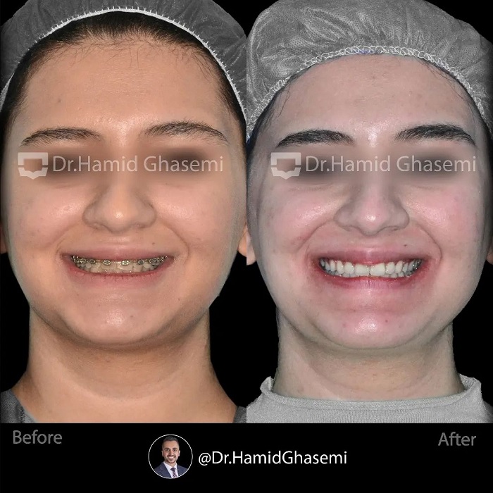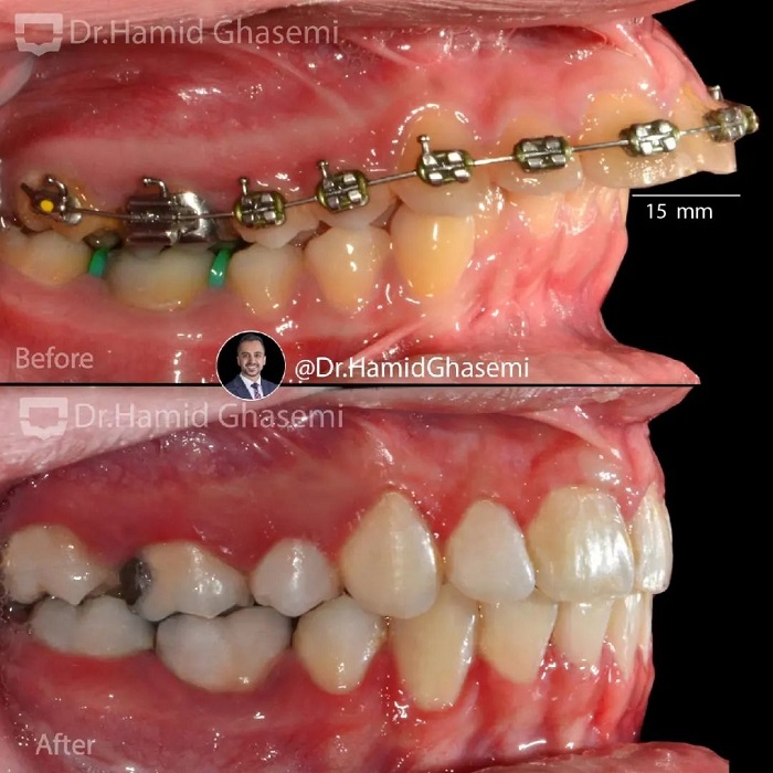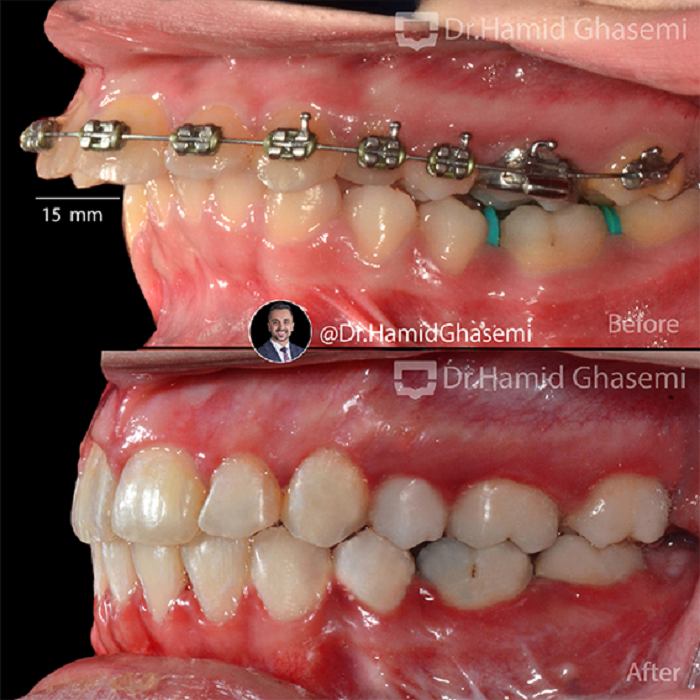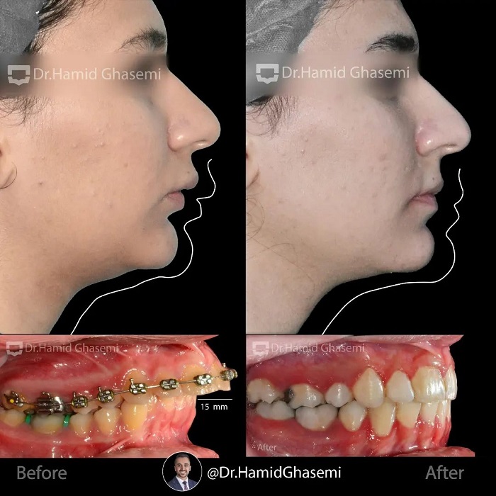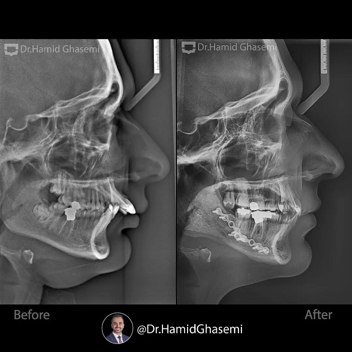 درمان ارتودنسی توام با جراحی ادونسمنت فک پایین در کیس کلاس ۲ با مشکل جلوزدگی شدید آرچ فکی بالا و عقب زدگی فک پایین.