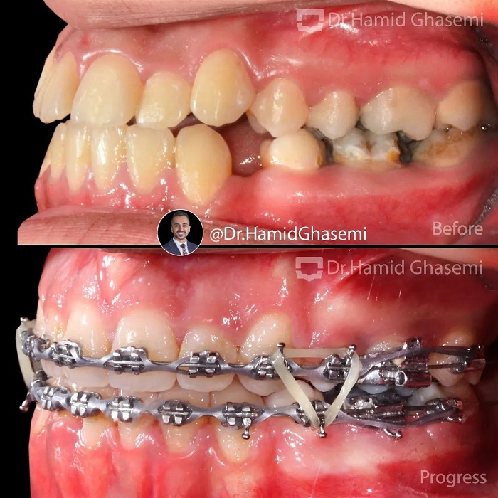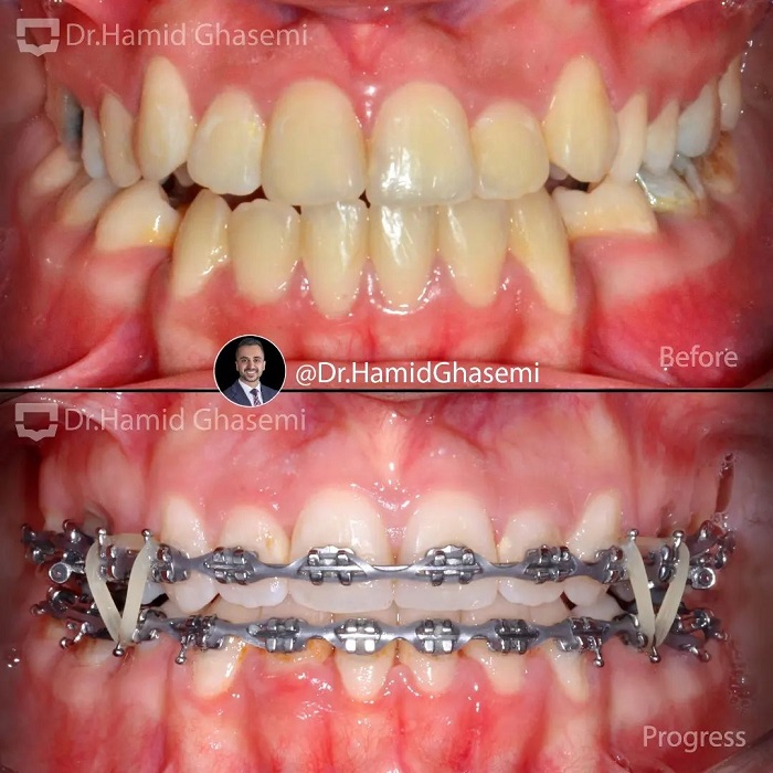 این کیس توسط یکی از همکاران جهت درمان مجدد ارجاع داده شد در حالی که درمانگر سابق با کشیدن دندانهای پرمولر اول پایین سعی در انجام درمان داشتند. از نظر من درمان این کیس شاید بدون کشیدن دندان و یا در بدترین حالت با کشیدن دندانهای عقل بالا و پایین قابل درمان بود ولی با توجه به شرایط حاضر منطقی ترین درمان با کشیدن دندانهای پرمولر اول بالا انجام شد. درمان در حال حاضر در مراحل پایانی میباشد.