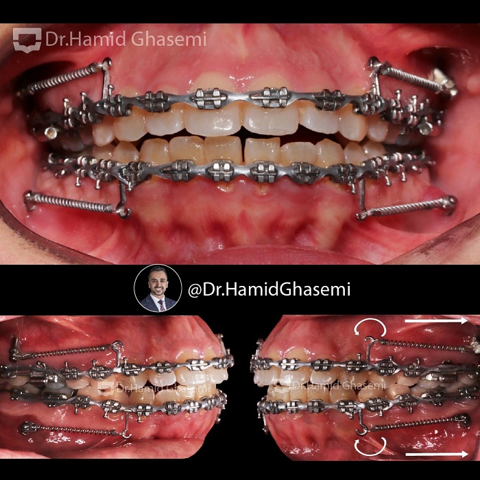Using Infrazygomatic screws in upper arch and buccal self screws in lower arch in order to retract both arches and create clockwise rotation of upper arch and counter clockwise rotation of lower arch in order to close anteriot openbite..